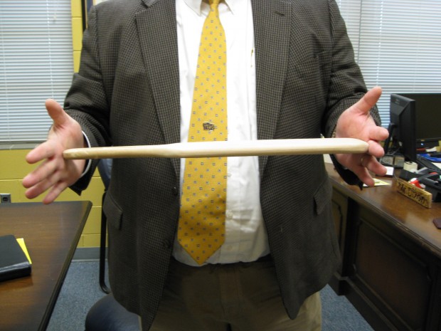 The paddle is light in weight. It’s about 6 ounces, 16 inches long, 5 inches wide, and half an inch thick and made of ash wood. Dixson says the school decided that was a good size.