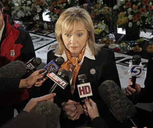 Oklahoma Gov. Mary Fallin speaks to the media before the memorial to OSU women’s basketball Head Coach Kurt Budke and assistant coach Miranda Serna. Published January 11, 2012 at 300 × 251 in Oklahoma Gov. Mary Fallin speaks to the media before the memorial to OSU women’s basketball Head Coach Kurt Budke and assistant coach Miranda Serna.