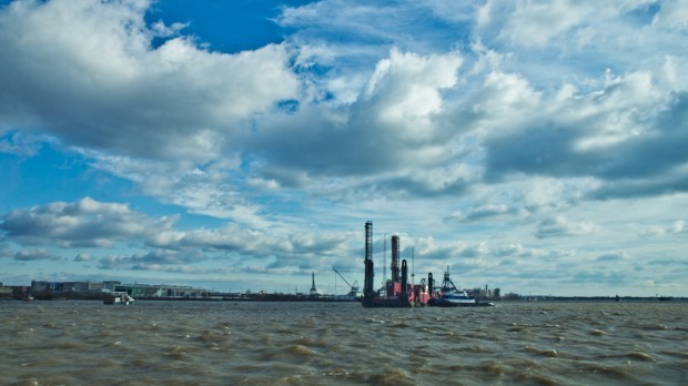 The Drillboat Apache sits in the Delaware River near Marcus Hook, Pennsylvania. From December 2015 to March 2016, the crew on this boat was blasting rock outcroppings on the river bottom. It’s one of the last stages of a controversial project to deepen the river’s shipping channel by five feet.