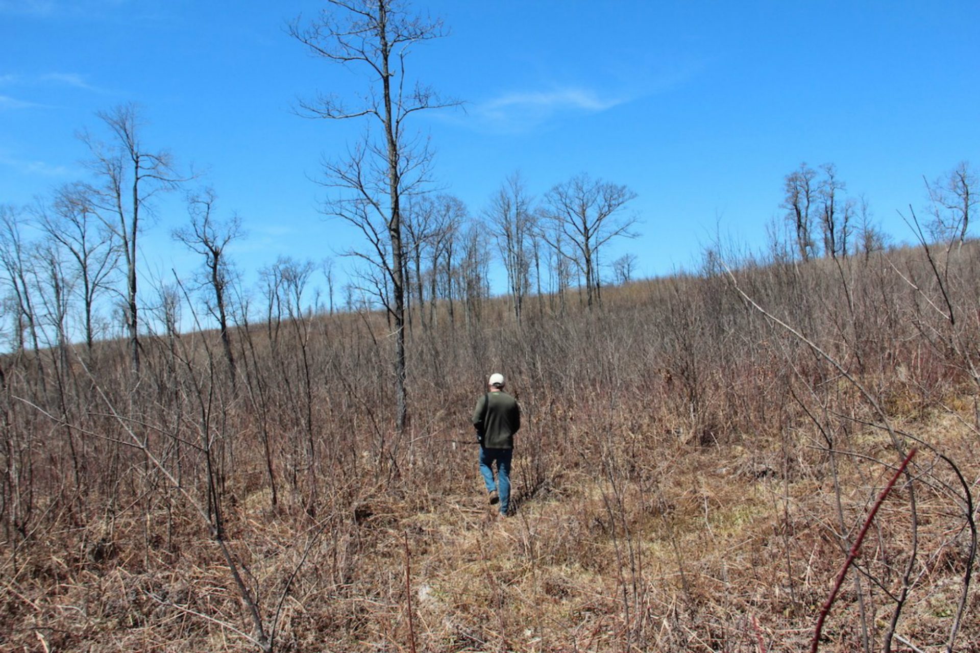 At a field in Game Lands 33, Larkin waded through a tangle of blackberry bushes, and oak and maple saplings that are growing back.