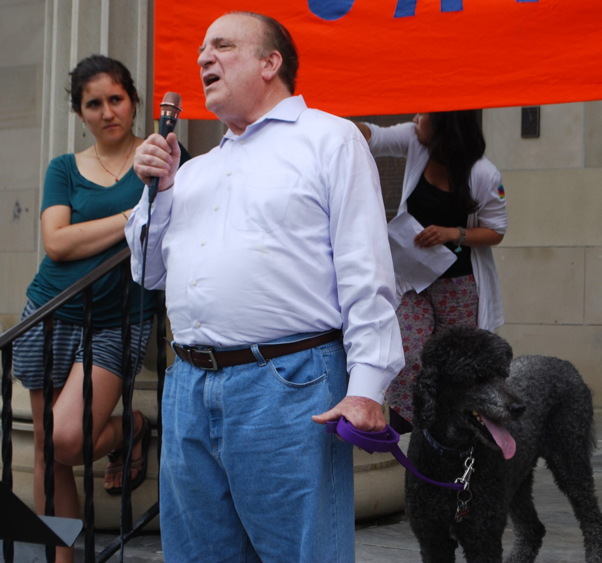 State Sen. Andy Dinniman, (D-Chester County) with his dog Jagger, told protesters in West Chester on Saturday that state officials must ensure the Mariner East pipelines don’t endanger public safety.