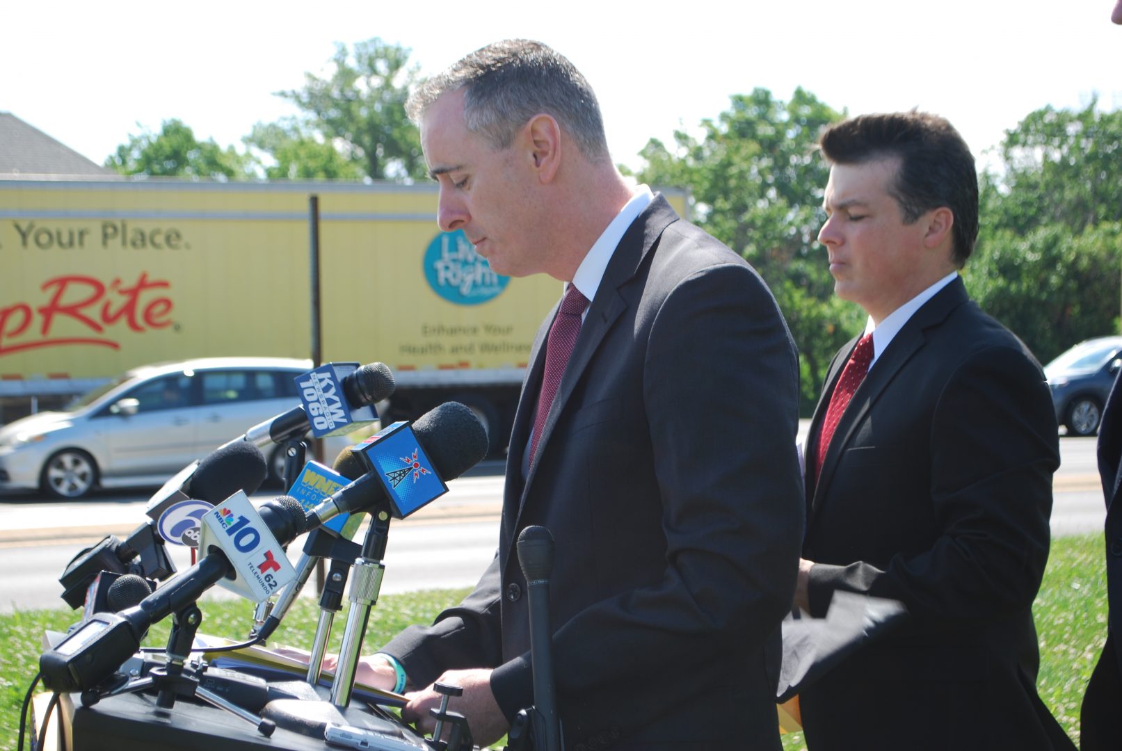 Pennsylvania Congressmen Brian Fitzpatrick, a Republican (left), and Brendan Boyle, a Democrat, urged EPA to set national regulation on PFAS chemicals. They spoke outside Horsham Air Guard Station in Bucks County, Pa. on June 25. Fitzpatrick called on EPA Administrator Scott Pruitt to resign in part because of his handling of a report on the toxic chemicals.