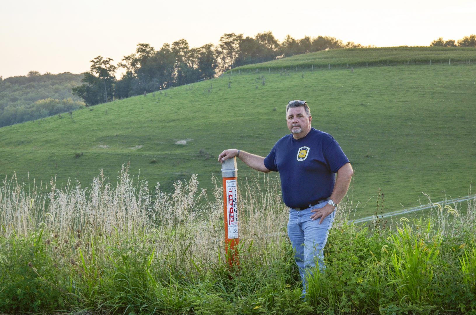 Chief Bob Rosatti of the Forbes Road Volunteer Fire Department stands alongside a marker for the Texas Eastern Transmission Pipeline, which exploded here in Salem Township in 2016.