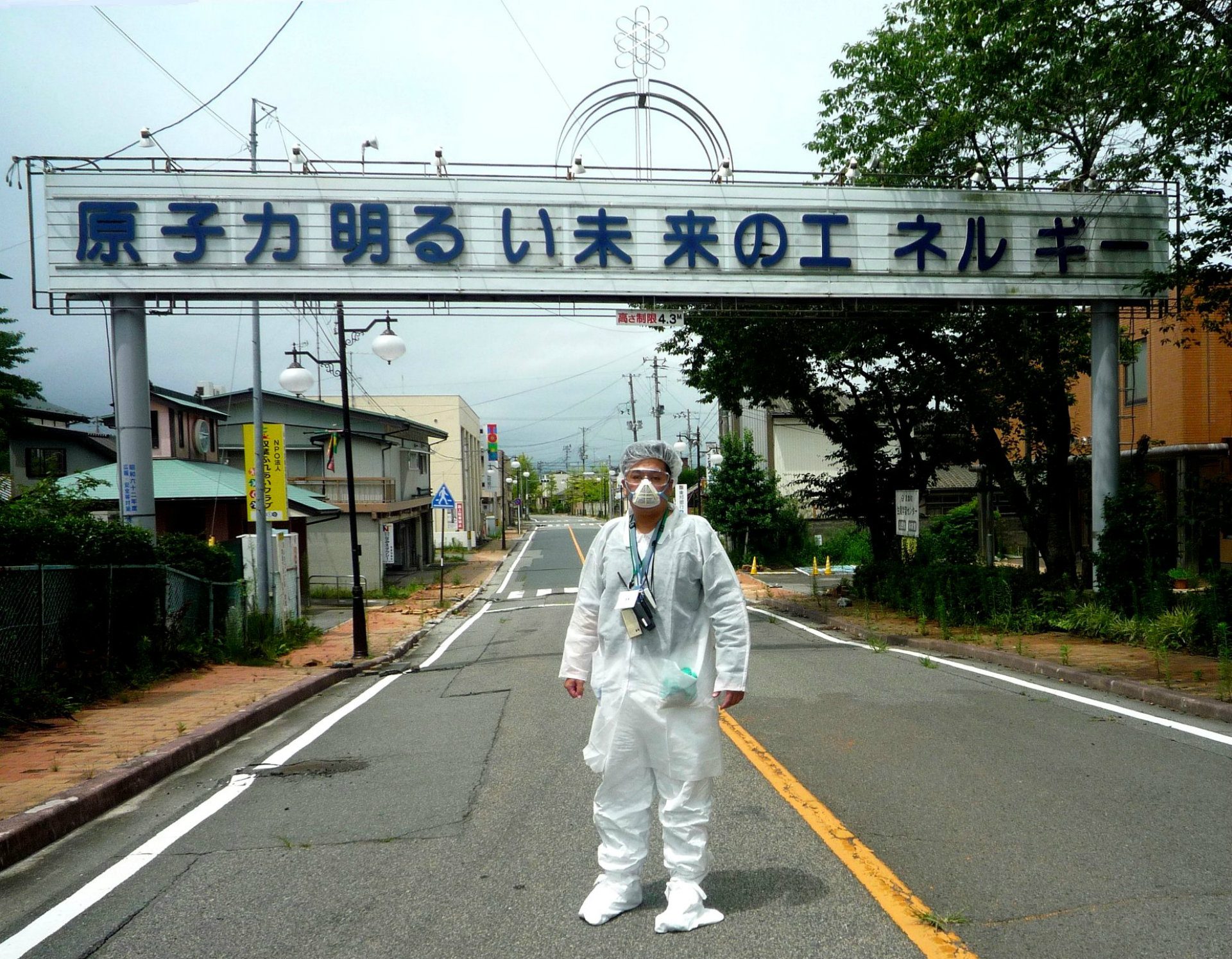 Then he showed another photo. It’s only a few months after the accident, and no one is left living in Futaba. This time, he’s wearing a protective Tyvek suit and mask, he’s standing below the sign holding up a placard that changes his slogan to: