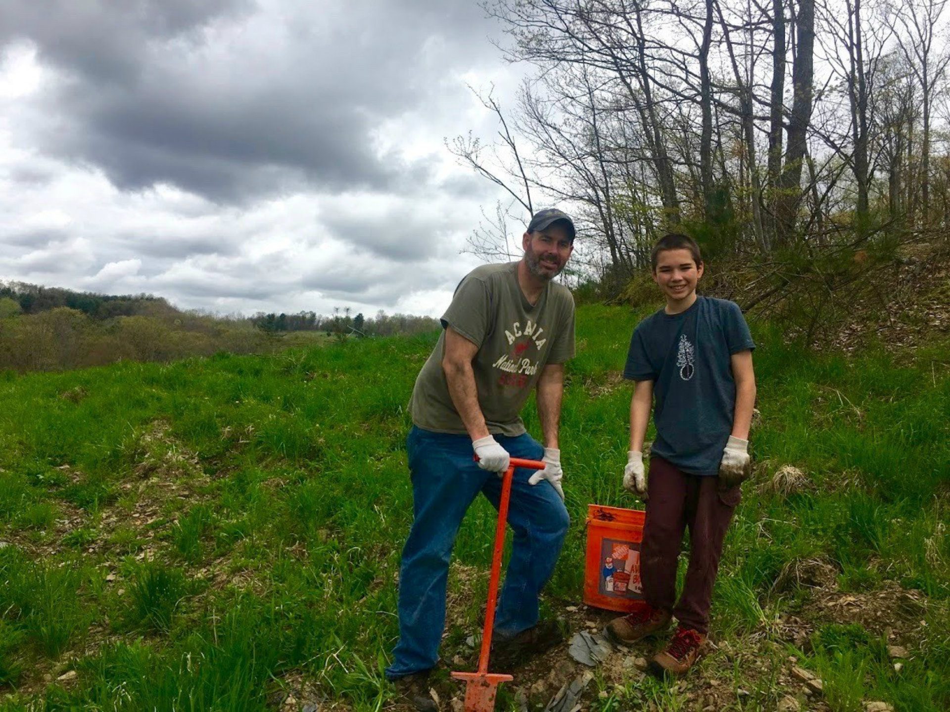 Ron and Trey Slavonic plant saplings on reclaimed mine land in the Moshannon State Forest as part of an ongoing reforestation project.
