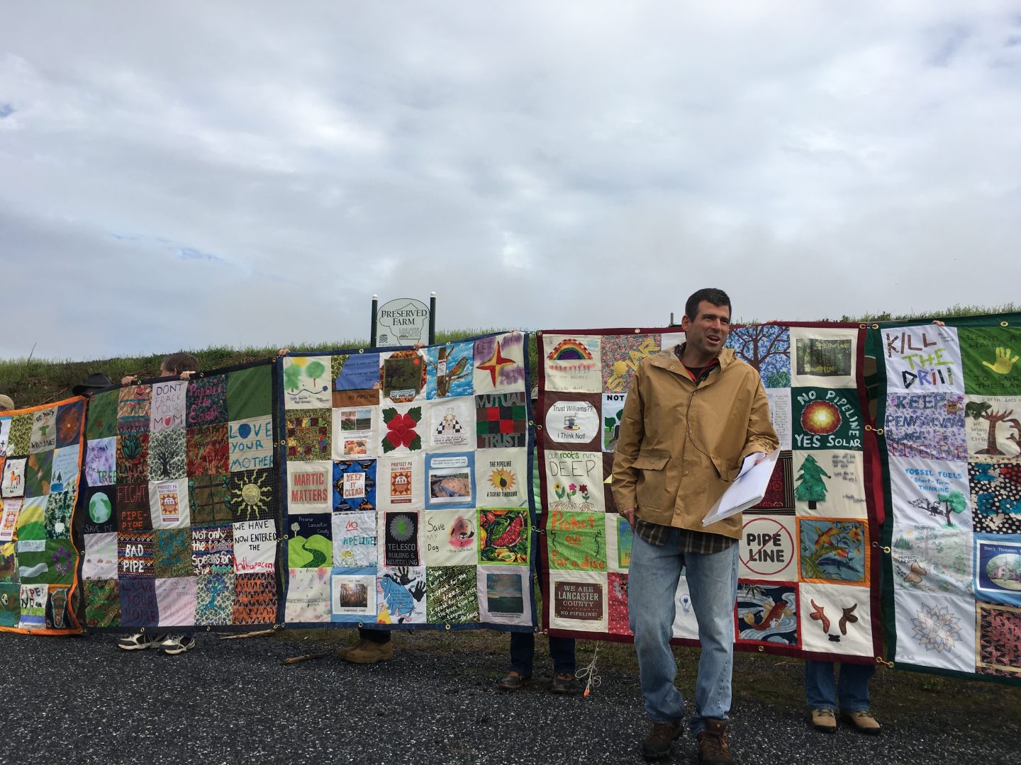 Mark Clatterbuck stands in front of a quilt designed to protest the Atlantic Sunrise pipeline.