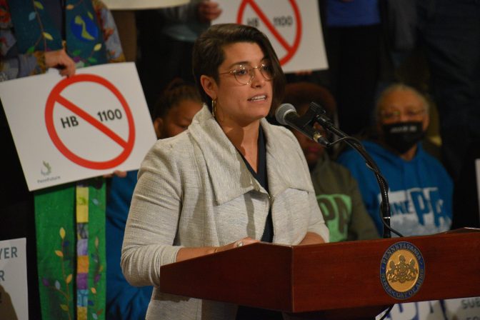 State Rep. Sara Innamorato (D-Allegheny) speaks in opposition to House Bill 1100 during a rally at the state Capitol on March 9, 2020