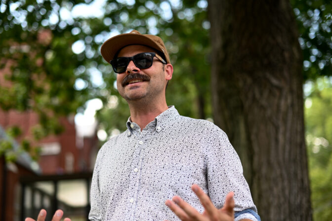 Cody Kiefer stands amid a neighborhood of houses with wide windows, red brick, white trim, and doric columns.