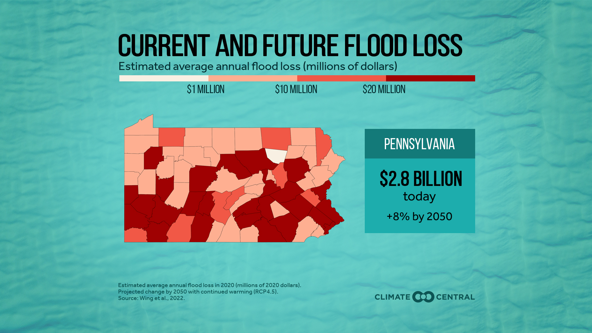 Climate Central reports flood damage cost Pennsylvania nearly $2.8 billion in 2020. That could rise 8% by 2050 as global temperatures continue to rise.